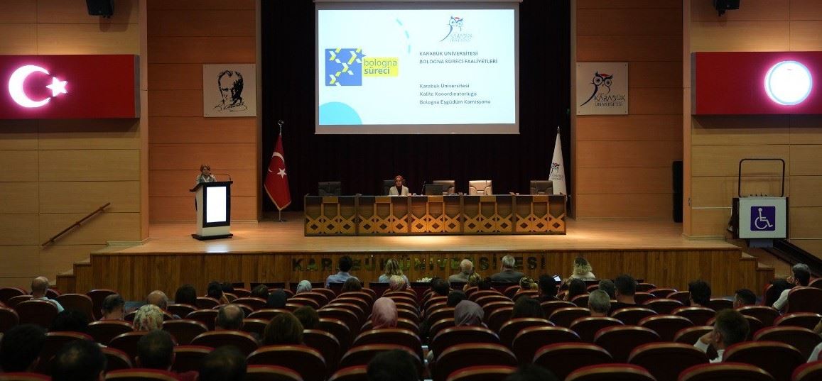 Karabük Üniversitesinde, Bologna Süreci’nin üniversitenin kalite ve uluslararasılaşma hedeflerine katkısı düzenlenen eğitimle değerlendirildi. Bu kapsamda, Bologna Süreci’nde yürütülen faaliyetler ve gelinen aşamalar, ilgili akademik birimlerin temsilcilerinin katılımıyla düzenlenen eğitim programında ele alındı. 25 Eylül 2025 tarihinde 15 Temmuz Şehitler Konferans Salonu’nda gerçekleştirilen programa Rektör Yardımcısı Prof. Dr. Elif Çepni, bazı dekanlar, fakülte temsilcileri ve akademisyenler katıldı.